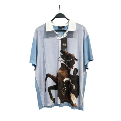 STUSSY/WALES BONNER/Polo Shirt/XL/Silk/BLU/HORSE RIDER SILK POLO